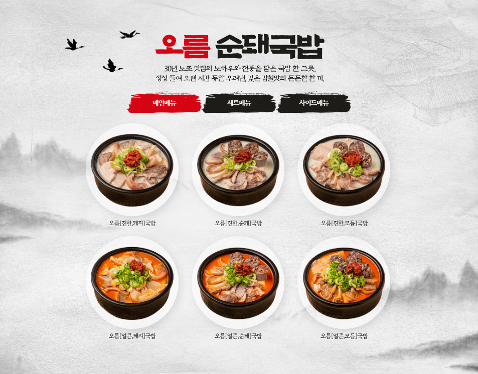 메뉴 : 돼지국밥, 병천순대, 삼겹수육 편육, 갈비만두 등 세트메뉴
